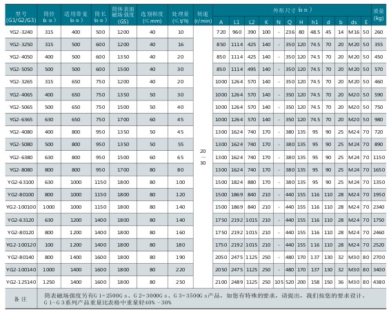 YG2系列半磁永磁辊多用于对粉状、颗粒状、小块状物料的净化处理及钢渣和矿石的磁选处理、或对铁质的回收利用,对防止破碎机、研磨机、压榨机的破坏和磨损起着可靠的保护作用。它安装方便、吸力强、无能耗、连续工作、操作简单。根据TD-75型带式输送机标准设计,能满足广大用户对高场强、大深度除铁的使用要求。广泛应用于冶金、磁选、磨料磨具、金刚砂、非金属矿、耐火材料、矿山、食品、化工、玻璃、建材等行业。