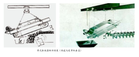 轨道方向:根据现场条件,除铁器在大皮带机头上方吊挂,其轨道可与大皮带方向垂直或同向。若除铁器在大皮带上下山段或水平上方吊挂,其轨道方向必须与大皮带方向垂直。